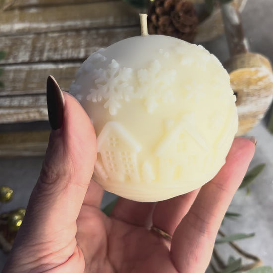 Plongez dans l’ambiance magique de l’hiver avec cette bougie sphérique aux détails délicats : flocons de neige et petits chalets sculptés à la main.