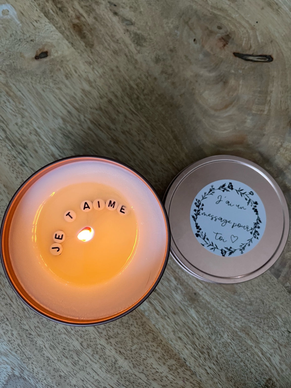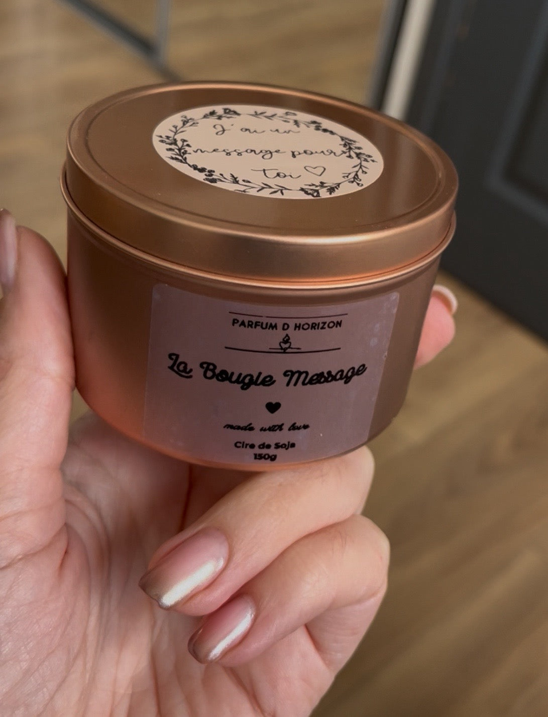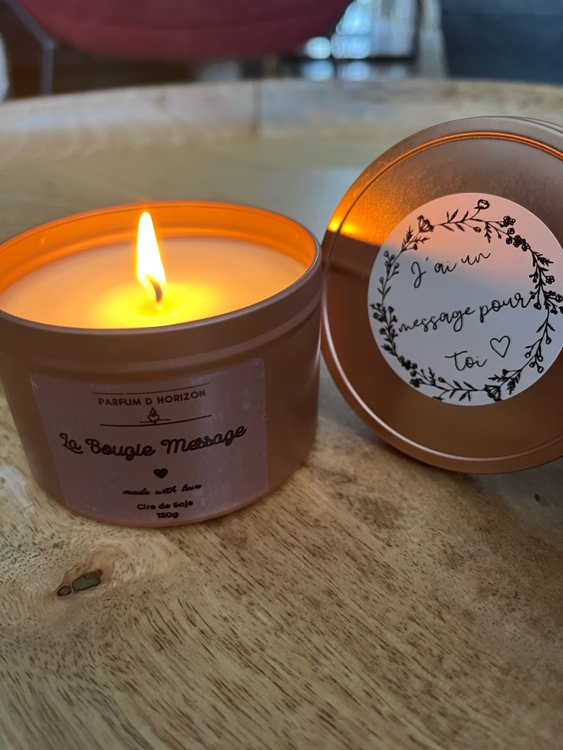 Chaque Bougie Message Parfum d’Horizon renferme un mot doux, un prénom ou une attention délicate qui se révèle au fil de la flamme. Faite à la main avec cire de soja 100 % végétale, elle diffuse un parfum délicat tout en laissant apparaître un message caché une fois la cire fondue — une surprise pleine de tendresse.