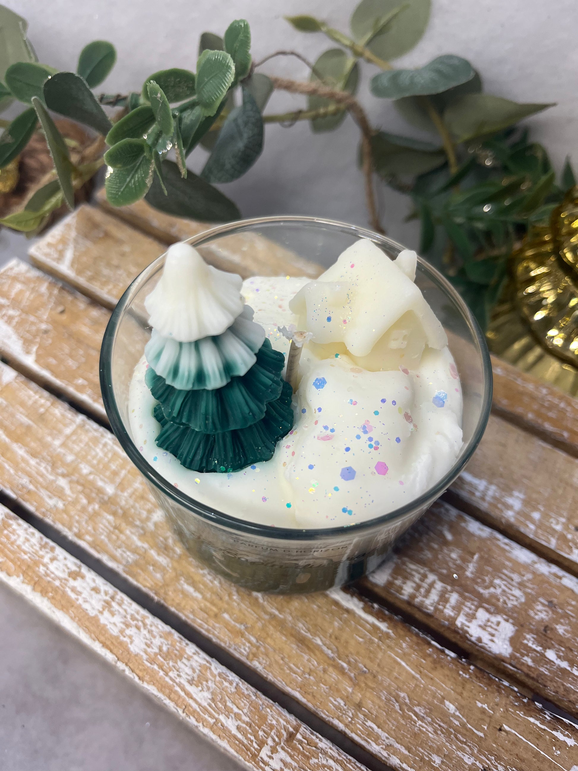 Coulée à la main dans mon atelier, Le Sapin du Chalet associe une cire de soja naturelle, une décoration en cire moulée en forme de sapin et de maisonnette, ainsi qu’un topping chantilly délicatement pailleté pour une finition féérique.